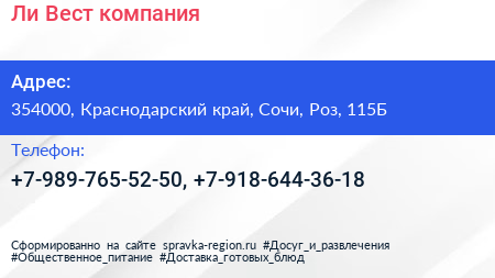 Ли Вест, компания по адресу 354000, Краснодарский край, Сочи, Роз, 115Б в дальнейшем Организация, размещена в следующих категориях: