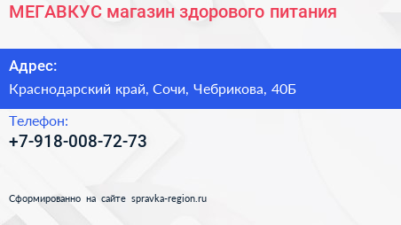 МЕГАВКУС, магазин здорового питания по адресу Краснодарский край, Сочи, Чебрикова, 40Б в дальнейшем Организация, размещена в следующих категориях: