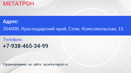 МЕТАТРОН по адресу 354000, Краснодарский край, Сочи, Комсомольская, 11 в дальнейшем Организация, размещена в следующих категориях: