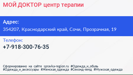 МОЙ ДОКТОР, центр терапии по адресу 354207, Краснодарский край, Сочи, Прозрачная, 19 в дальнейшем Организация, размещена в следующих категориях: