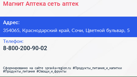 Магнит-Аптека, сеть аптек по адресу 354065, Краснодарский край, Сочи, Цветной бульвар, 5 в дальнейшем Организация, размещена в следующих категориях: