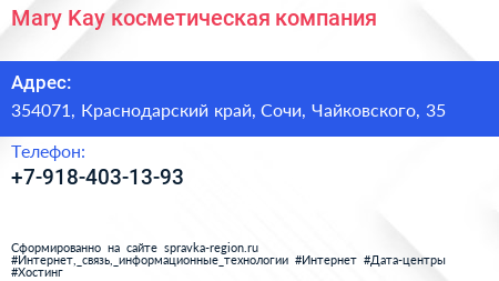 Mary Kay, косметическая компания по адресу 354071, Краснодарский край, Сочи, Чайковского, 35 в дальнейшем Организация, размещена в следующих категориях: