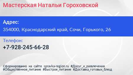Мастерская Натальи Гороховской по адресу 354000, Краснодарский край, Сочи, Горького, 26 в дальнейшем Организация, размещена в следующих категориях: