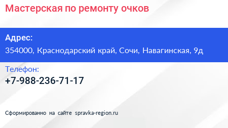 Мастерская по ремонту очков по адресу 354000, Краснодарский край, Сочи, Навагинская, 9д в дальнейшем Организация, размещена в следующих категориях: