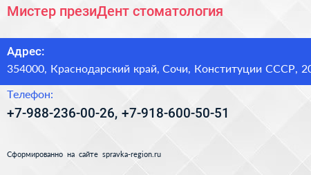 Мистер презиДент, стоматология по адресу 354000, Краснодарский край, Сочи, Конституции СССР, 20 в дальнейшем Организация, размещена в следующих категориях: