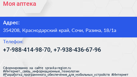 Моя аптека по адресу 354208, Краснодарский край, Сочи, Разина, 18/1а в дальнейшем Организация, размещена в следующих категориях: