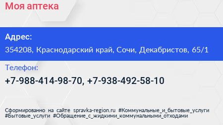 Моя аптека по адресу 354208, Краснодарский край, Сочи, Декабристов, 65/1 в дальнейшем Организация, размещена в следующих категориях: