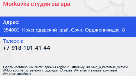Morkovka, студия загара по адресу 354000, Краснодарский край, Сочи, Орджоникидзе, 8 в дальнейшем Организация, размещена в следующих категориях: