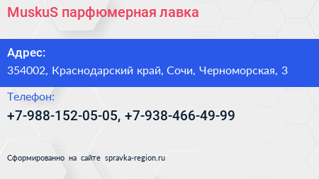 MuskuS, парфюмерная лавка по адресу 354002, Краснодарский край, Сочи, Черноморская, 3 в дальнейшем Организация, размещена в следующих категориях: