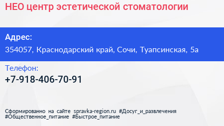 НЕО, центр эстетической стоматологии по адресу 354057, Краснодарский край, Сочи, Туапсинская, 5а в дальнейшем Организация, размещена в следующих категориях: