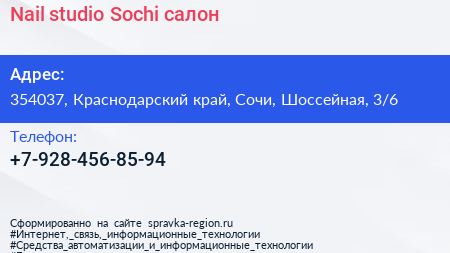 Nail studio Sochi, салон по адресу 354037, Краснодарский край, Сочи, Шоссейная, 3/6 в дальнейшем Организация, размещена в следующих категориях: