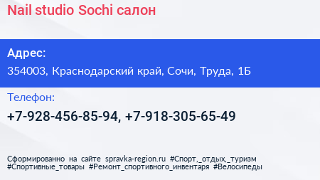 Nail studio Sochi, салон по адресу 354003, Краснодарский край, Сочи, Труда, 1Б в дальнейшем Организация, размещена в следующих категориях: