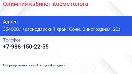 Олимпия, кабинет косметолога по адресу 354008, Краснодарский край, Сочи, Виноградная, 20а в дальнейшем Организация, размещена в следующих категориях: