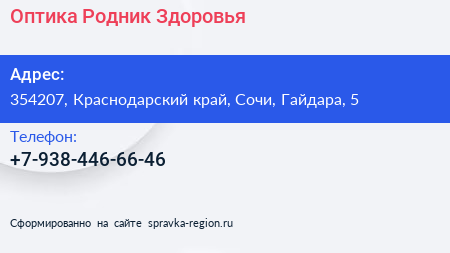 Оптика Родник Здоровья по адресу 354207, Краснодарский край, Сочи, Гайдара, 5 в дальнейшем Организация, размещена в следующих категориях: