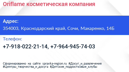 Oriflame, косметическая компания по адресу 354003, Краснодарский край, Сочи, Макаренко, 14Б в дальнейшем Организация, размещена в следующих категориях: