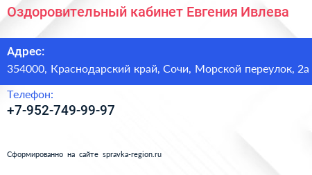 Оздоровительный кабинет Евгения Ивлева по адресу 354000, Краснодарский край, Сочи, Морской переулок, 2а в дальнейшем Организация, размещена в следующих категориях: