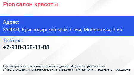Pion, салон красоты по адресу 354000, Краснодарский край, Сочи, Московская, 3 к5 в дальнейшем Организация, размещена в следующих категориях: