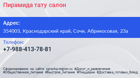 Пирамида, тату-салон по адресу 354003, Краснодарский край, Сочи, Абрикосовая, 23а в дальнейшем Организация, размещена в следующих категориях: