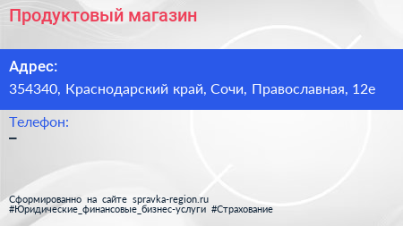 Продуктовый магазин по адресу 354340, Краснодарский край, Сочи, Православная, 12е в дальнейшем Организация, размещена в следующих категориях: