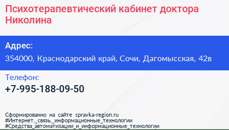 Психотерапевтический кабинет доктора Николина по адресу 354000, Краснодарский край, Сочи, Дагомысская, 42в в дальнейшем Организация, размещена в следующих категориях: