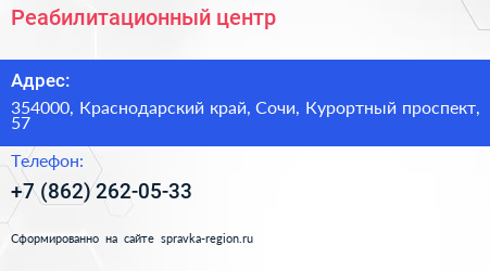 Реабилитационный центр по адресу 354000, Краснодарский край, Сочи, Курортный проспект, 57 в дальнейшем Организация, размещена в следующих категориях: