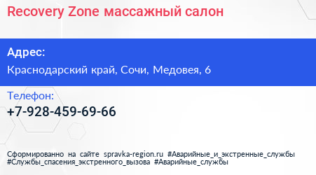 Recovery Zone, массажный салон по адресу Краснодарский край, Сочи, Медовея, 6 в дальнейшем Организация, размещена в следующих категориях: