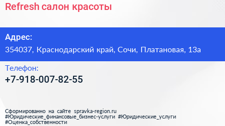 Refresh, салон красоты по адресу 354037, Краснодарский край, Сочи, Платановая, 13а в дальнейшем Организация, размещена в следующих категориях: