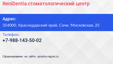 ReniDentia, стоматологический центр по адресу 354000, Краснодарский край, Сочи, Московская, 25 в дальнейшем Организация, размещена в следующих категориях: