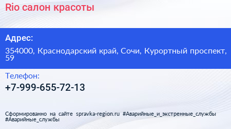 Rio, салон красоты по адресу 354000, Краснодарский край, Сочи, Курортный проспект, 59 в дальнейшем Организация, размещена в следующих категориях: