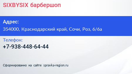 SIXBYSIX, барбершоп по адресу 354000, Краснодарский край, Сочи, Роз, 6/6а в дальнейшем Организация, размещена в следующих категориях: