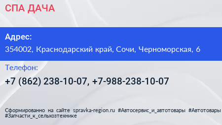 СПА ДАЧА по адресу 354002, Краснодарский край, Сочи, Черноморская, 6 в дальнейшем Организация, размещена в следующих категориях: