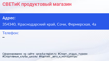 СВЕТиК, продуктовый магазин по адресу 354340, Краснодарский край, Сочи, Фермерская, 4а в дальнейшем Организация, размещена в следующих категориях: