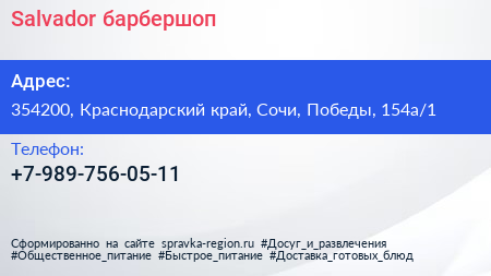 Salvador, барбершоп по адресу 354200, Краснодарский край, Сочи, Победы, 154а/1 в дальнейшем Организация, размещена в следующих категориях: