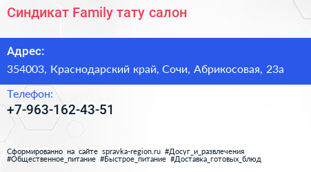 Синдикат Family, тату-салон по адресу 354003, Краснодарский край, Сочи, Абрикосовая, 23а в дальнейшем Организация, размещена в следующих категориях: