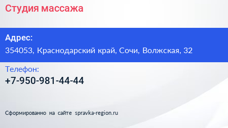 Студия массажа по адресу 354053, Краснодарский край, Сочи, Волжская, 32 в дальнейшем Организация, размещена в следующих категориях: