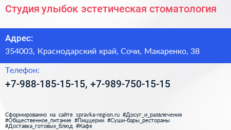Студия улыбок, эстетическая стоматология по адресу 354003, Краснодарский край, Сочи, Макаренко, 38 в дальнейшем Организация, размещена в следующих категориях: