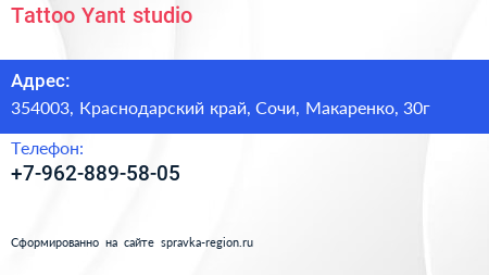 Tattoo Yant studio по адресу 354003, Краснодарский край, Сочи, Макаренко, 30г в дальнейшем Организация, размещена в следующих категориях: