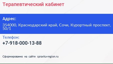 Терапевтический кабинет по адресу 354000, Краснодарский край, Сочи, Курортный проспект, 50/1 в дальнейшем Организация, размещена в следующих категориях: