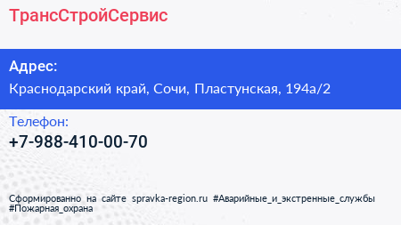 ТрансСтройСервис по адресу Краснодарский край, Сочи, Пластунская, 194а/2 в дальнейшем Организация, размещена в следующих категориях: