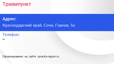 Травмпункт по адресу Краснодарский край, Сочи, Горная, 5а в дальнейшем Организация, размещена в следующих категориях: