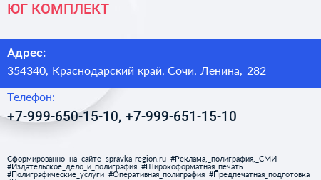 ЮГ-КОМПЛЕКТ по адресу 354340, Краснодарский край, Сочи, Ленина, 282 в дальнейшем Организация, размещена в следующих категориях: