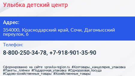 Улыбка, детский центр по адресу 354000, Краснодарский край, Сочи, Дагомысский переулок, 6 в дальнейшем Организация, размещена в следующих категориях: