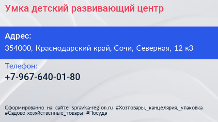 Умка, детский развивающий центр по адресу 354000, Краснодарский край, Сочи, Северная, 12 к3 в дальнейшем Организация, размещена в следующих категориях: