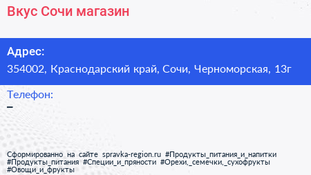 Вкус Сочи, магазин по адресу 354002, Краснодарский край, Сочи, Черноморская, 13г в дальнейшем Организация, размещена в следующих категориях: