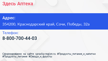 Здесь Аптека по адресу 354200, Краснодарский край, Сочи, Победы, 32а в дальнейшем Организация, размещена в следующих категориях: