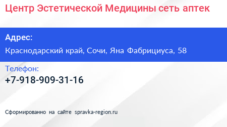 Центр Эстетической Медицины, сеть аптек по адресу Краснодарский край, Сочи, Яна Фабрициуса, 58 в дальнейшем Организация, размещена в следующих категориях: