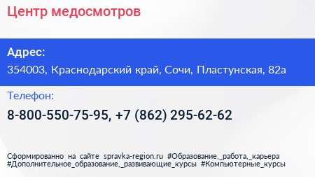 Центр медосмотров по адресу 354003, Краснодарский край, Сочи, Пластунская, 82а в дальнейшем Организация, размещена в следующих категориях: