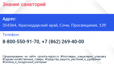 Знание, санаторий по адресу 354364, Краснодарский край, Сочи, Просвещения, 139 в дальнейшем Организация, размещена в следующих категориях: