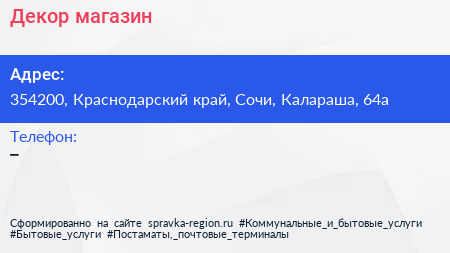 Декор, магазин по адресу 354200, Краснодарский край, Сочи, Калараша, 64а в дальнейшем Организация, размещена в следующих категориях: