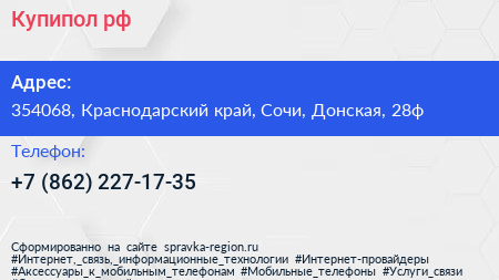 Купипол.рф по адресу 354068, Краснодарский край, Сочи, Донская, 28ф в дальнейшем Организация, размещена в следующих категориях:
